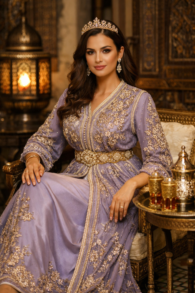 In Marokko haben sich zwei Hauptformen etabliert: der Kaftan und die Takchita. Der klassische Kaftan ist ein langes, weit geschnittenes Kleid mit langen Ärmeln, das mit einem breiten Gürtel getragen wird, um die Silhouette zu betonen. Die Takchita besteht aus zwei Schichten: einem schlichten Unterkleid und einem reich verzierten Überkleid, das vorne teilweise geöffnet bleibt, sodass die Farben und Muster der unteren Schicht sichtbar bleiben. Beide Formen werden aus hochwertigen Materialien wie Seide, Baumwolle oder modernen Stoffmischungen gefertigt. Sie reichen von schlichten, einfarbigen Varianten bis zu äußerst aufwendigen Kreationen mit Gold- und Silberfäden, Perlen, Pailletten, Edelsteinen oder komplexen Stickmustern. Ein kunstvoll gearbeiteter Gürtel – häufig aus Metall oder geflochtenen Schnüren – vollendet das Ensemble und sorgt für die perfekte Passform.